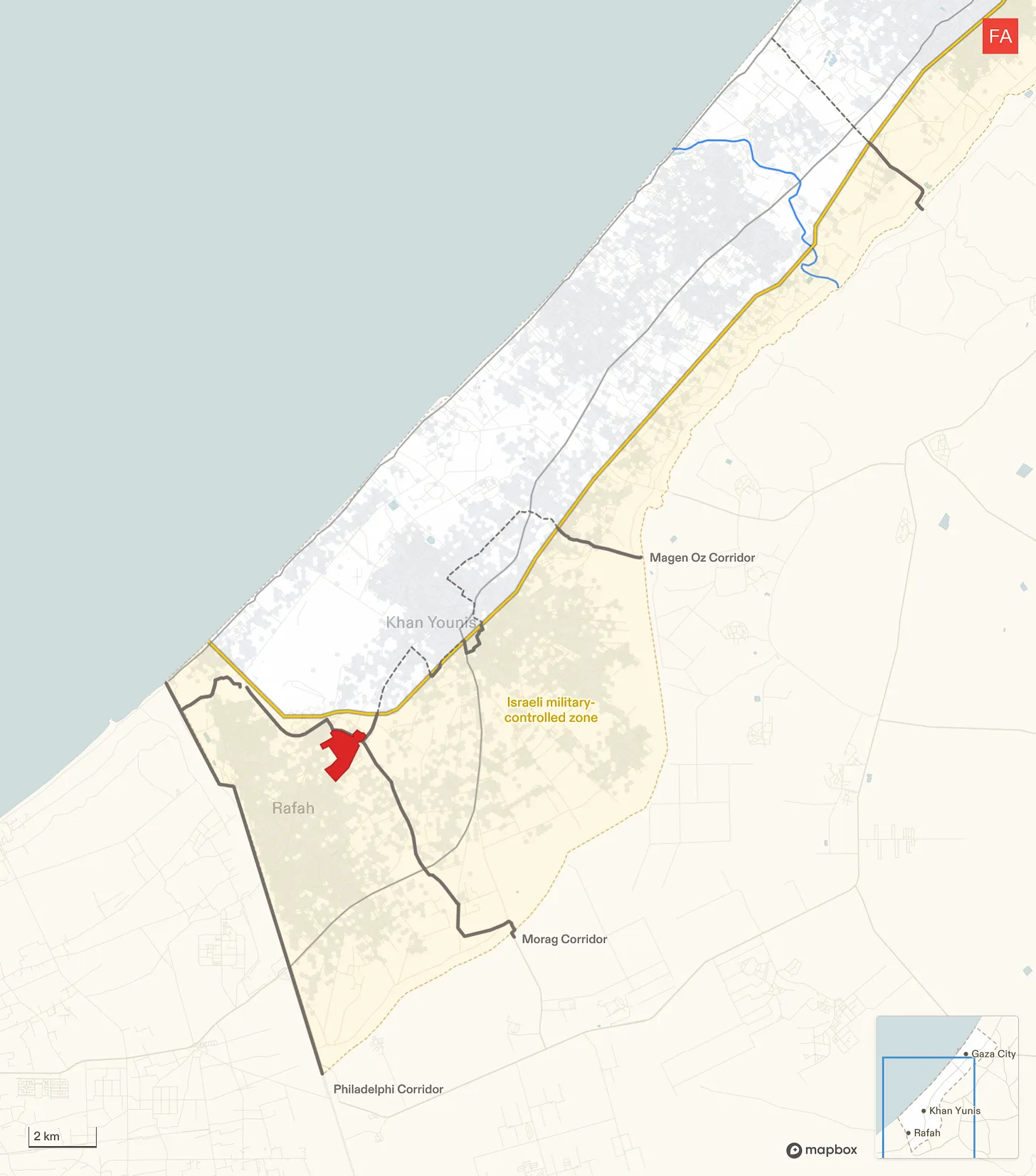 Since December, Israel has undertaken groundwork for what seems to be a development site in east Rafah, within the Israeli military-controlled zone. It sits at the intersection of the Morag and Magen Oz corridors, close to the “yellow line.”